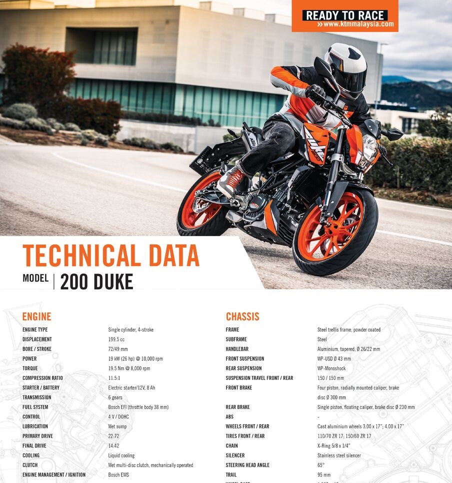 Di bawah ini, kami menyediakan spesifikasi baharu yang ada pada KTM 200 Duke MY18.