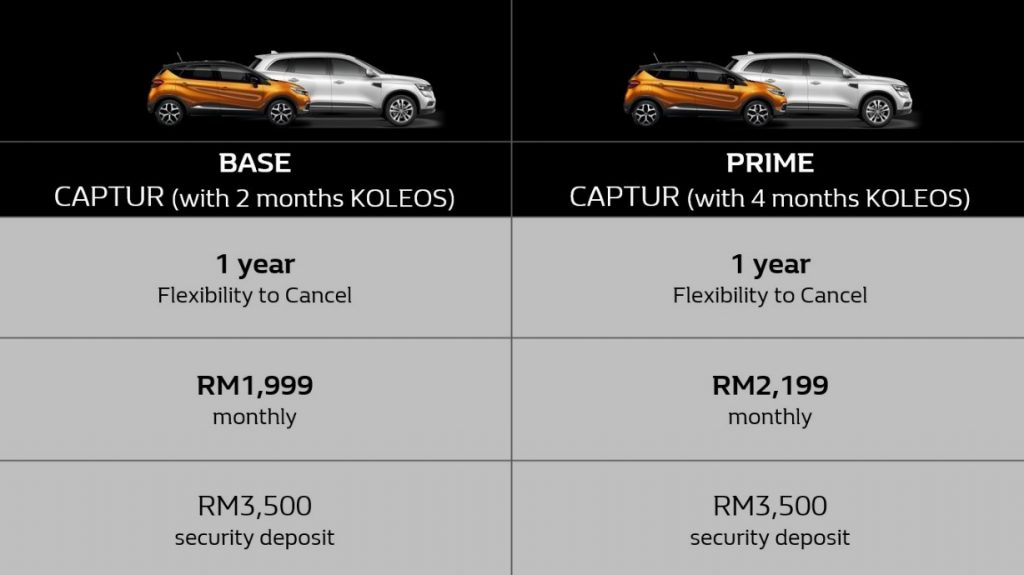Pelan Fixed membolehkan pelanggan memiliki Captur dari RM1,299 sebulan dan Koleos dari RM2,299 sebulan. Pelan Switch yang lebih fleksibel pula – yang pertama di Malaysia – membenarkan pelanggan menukar antara dua model ini dari RM1,999 sebulan bergantung kepada keperluan mereka.