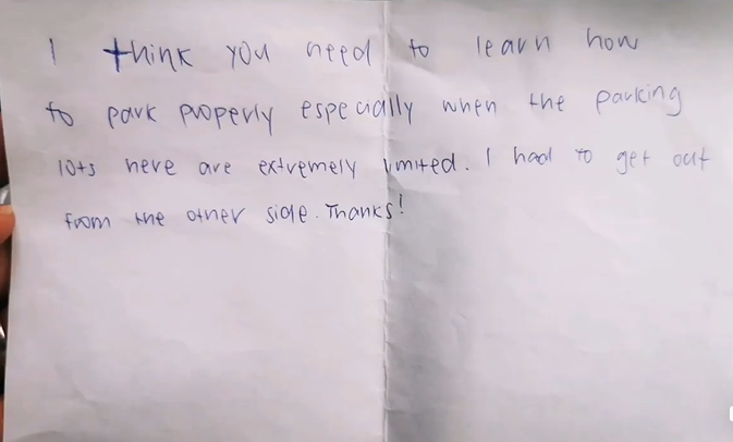 Rupa-rupanya, ia adalah gambar nota yang ditulis, yang menyatakan bahawa pemandu itu perlu “belajar cara parkir dengan betul”.