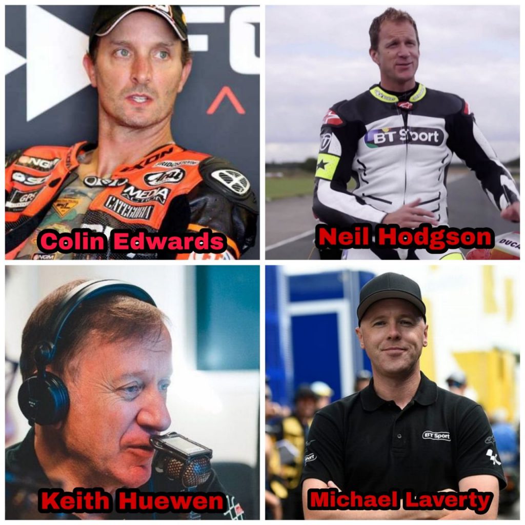 Di BT Sports, empat bekas pelumba, Colin Edwards, Neil Hodgson, Keith Huewen dan Michael Laverty, sudah bergelar pengulas.