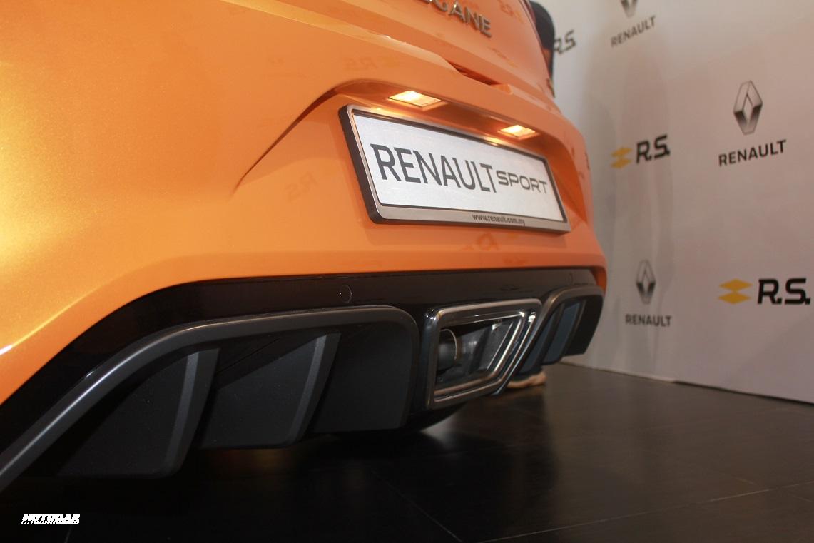 Di belakang, peresap belakang berfungsi meningkatkan downforce dan dikemaskan dengan gaya ekzos tengah yang menjadi identity Megane RS.