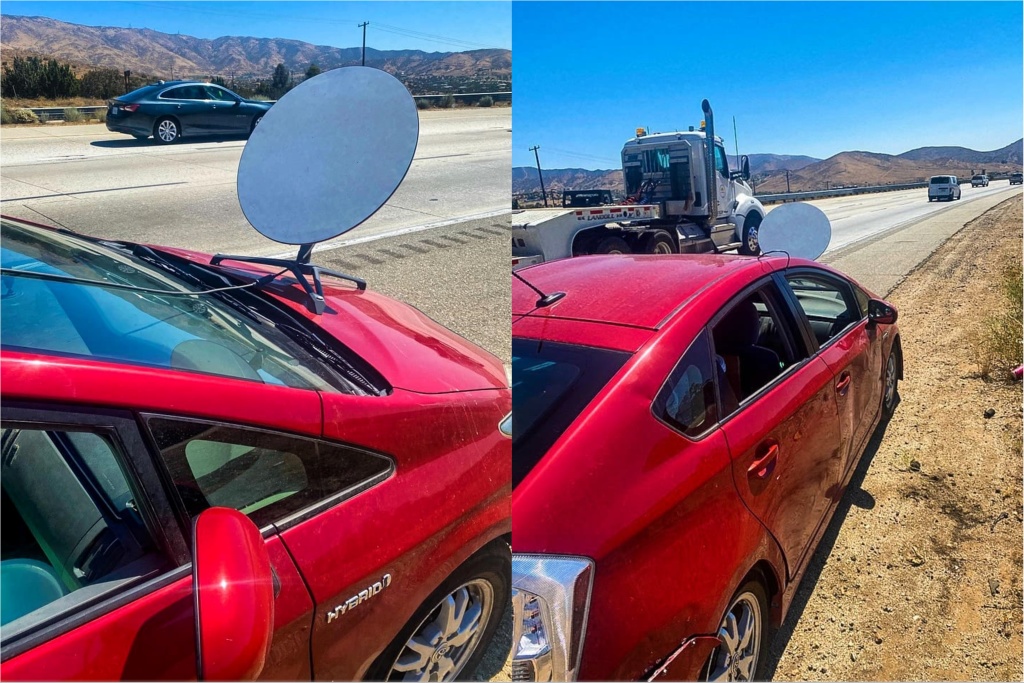 California Highway Patrol baru-baru ini menahan seorang pemandu Toyota Prius yang memasang piring satelit pada bonet depan keretanya.
