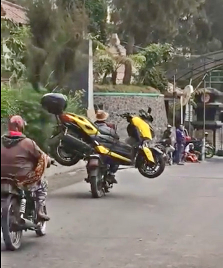 Uniknya motor yang digunakan untuk mengangkut skuter maksi 250cc itu hanyalah motor tua Honda GL. Yamaha XMax itu diikat di bahagian belakang motor dan ketika mula bergerak tukang ojek tidak mengalami masalah.