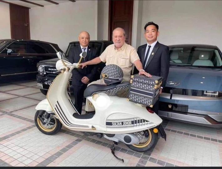 Kemudian skuter itu didatangkan dengan kotak belakang dengan logo Dior serta aksesori seperti helmet dan beg Dior. Namun, istimewanya skuter yang difahamkan milik Sultan Ibrahim itu tertera perkataan ‘SULTAN JOHOR’ pada bahagian sisi.