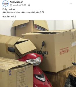Selain itu, dia juga berkongsi ingin menjual skrap sebuah motor selepas pemilik menghilangkan diri yang mana Ash terpaksa menanggung kerugian overhaul sebanyak RM800.