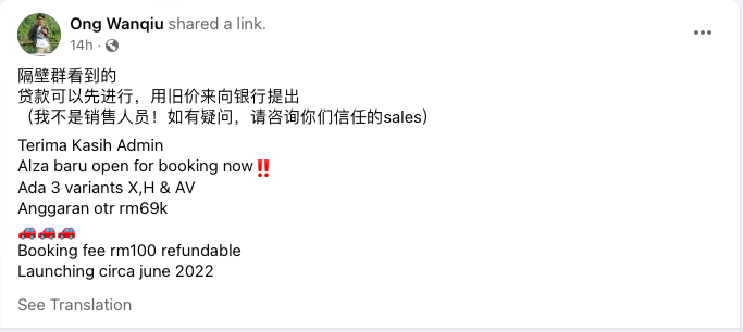 “Anggaran OTR RMR69k, booking fee RM100 refundable, launching Jun 2022,” tulisnya.