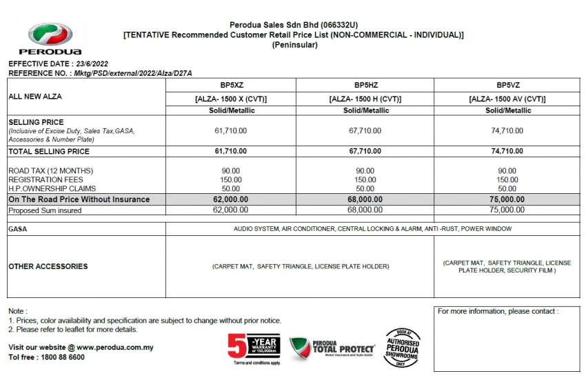 Difahamkan harga sebenar varian Alza akan didedahkan pada pelancaran rasmi kenderaan itu. Tempahan sebelum 1 Julai akan melayakkan pelanggan mendapat pengecualian SST dan jika kenderaan didaftarkan sebelum 31 Mac (2023), seperti diumumkan menteri baru-baru ini.