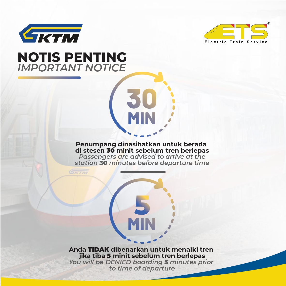 Keretapi Tanah Melayu Berhad (KTMB) menerusi akaun Facebook memuatnaik notis penting meminta pengguna perkhidmatan tren elektrik (ETS) agar tiba 30 minit lebih awal sebelum waktu pelepasan.