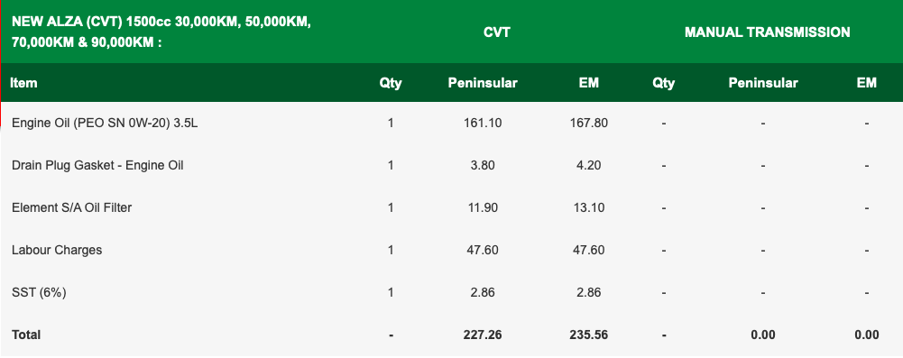 Di bawah ini kos penyelenggaraan Alza yang kami peroleh menerusi laman web rasmi Perodua dan melibatkan penggantian: