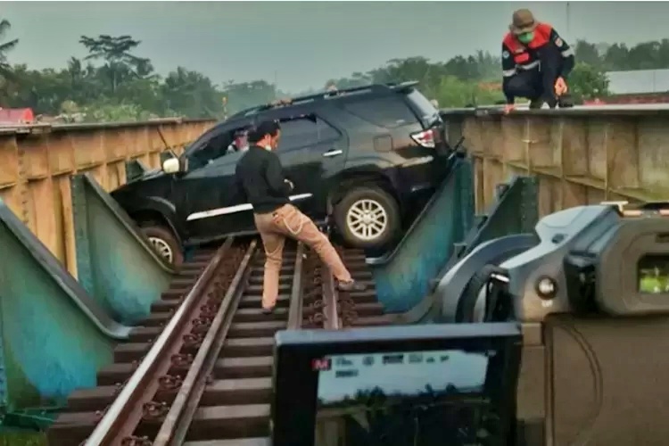 Sebuah Toyota Fortuner memasuki jalan kereta api sejauh 1km dan tersepit di Jambatan Sungai Angin di daerah Sumpiuh, wilayah Banyumas, Jawa Tengah.