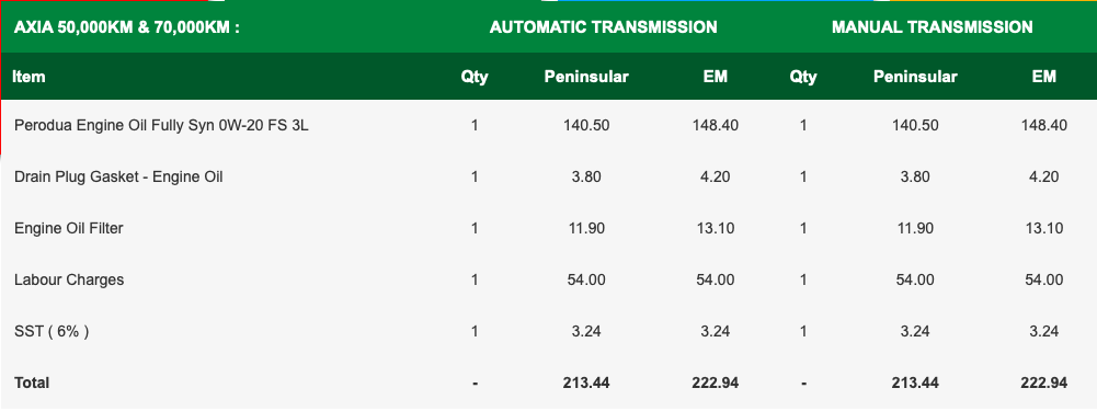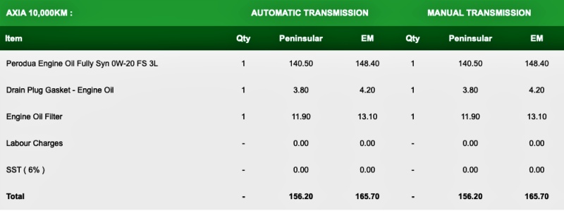 Selain itu, pemilik manual juga perlu menukar minyak hitam bersama penapis yang menjadikan kos selang servis keseluruhan adalah RM283.12.