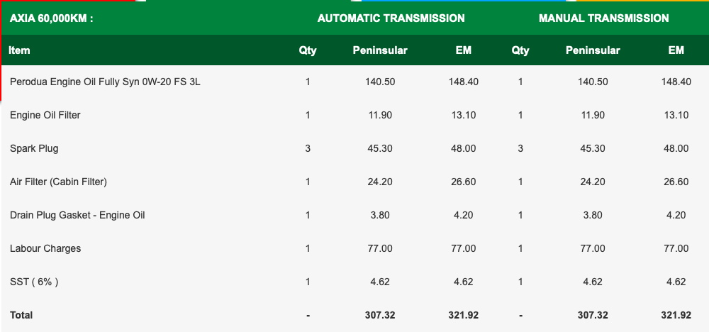 Ini menjadikan kos servis Axia adalah RM 238.70 yang mana pemilik juga perlu membayar harga sama bagi servis 90,000km.