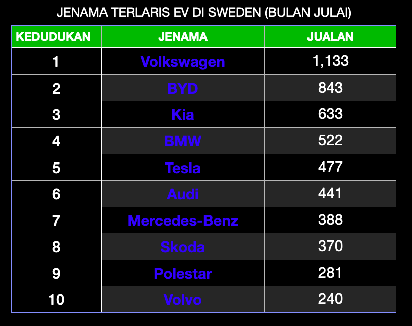 Dalam tempoh itu, lima jenama EV terlaris di Sweden adalah Volkswagen di tangga pertama dengan jualan 1,133 unit diikuti BYD (843), Kia (633), BMW (522) dan Tesla (477).