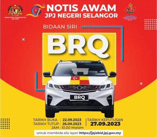 Jabatan Pengangkutan Jalan (JPJ) Malaysia mengumumkan pembukaan pendaftaran bidaan nombor pendaftaran Selangor, BRQ bermula 22 September sehingga 26 September (Selasa).