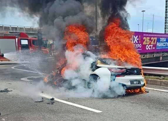 Sebuah BMW i8 terbakar sepenuhnya dalam kejadian berhampiran Stesen Transit Aliran Ringan (LRT) Sri Petaling, Lebuh Raya Shah Alam (Kesas), Kuala Lumpur.