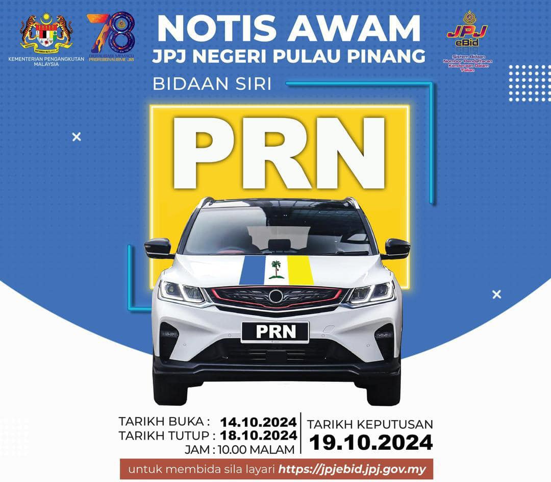 Jabatan Pengangkutan Jalan (JPJ) Malaysia mengumumkan pembukaan pendaftaran bidaan nombor pendaftaran Pulau Pinang, PRN bermula 14 sehingga 18 Oktober (Jumaat).