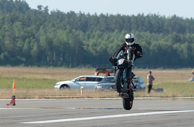 Carlsson menggunakan KTM 1290 Super Duke R untuk cubaan aksi wheelie bar hendal, dan KTM 390 Duke yang lebih ergonomik untuk cubaan tunggangan duduk terbalik.
