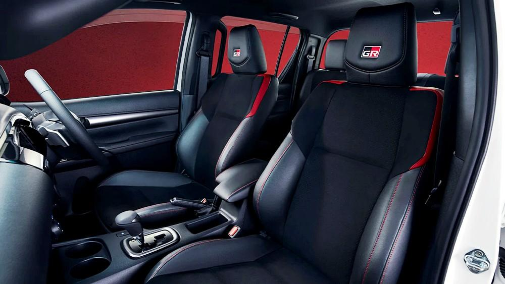 Bahagian dalaman Hilux GR Sport menawarkan gabungan keselesaan dan kecanggihan. Gaya dalaman sporty dengan jahitan merah di seluruh ruang dalaman mewujudkan ciri-ciri istimewa.