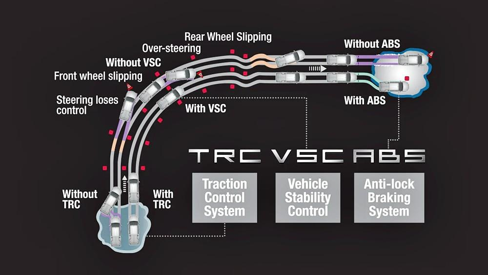 - Sistem Kawalan Kestabilan Kenderaan (VSC) dengan Kawalan Cengkaman (TRC): VSC menghalang Hilux daripada berpusing apabila pergerakan mendadak diperlukan, manakala TRC meningkatkan cengkaman apabila bergerak/memecut di permukaan licin.