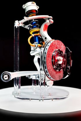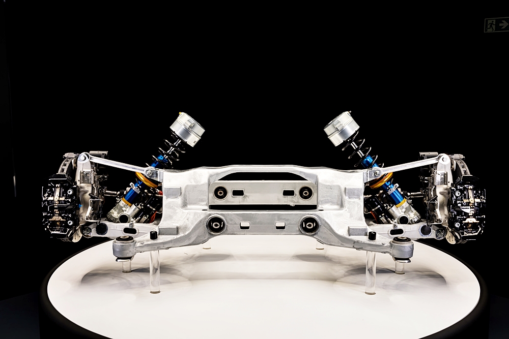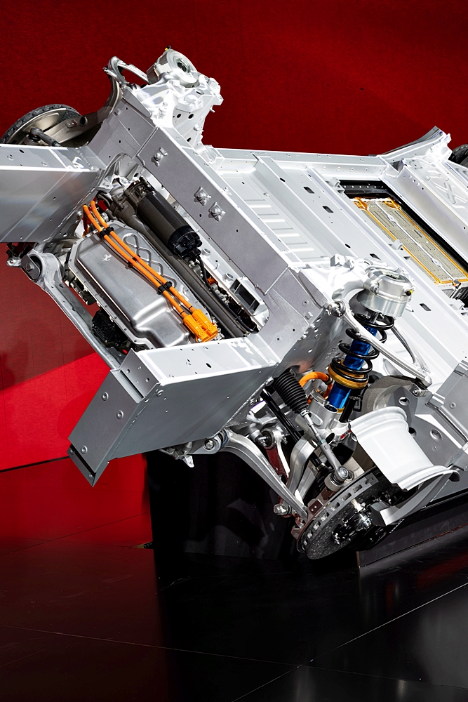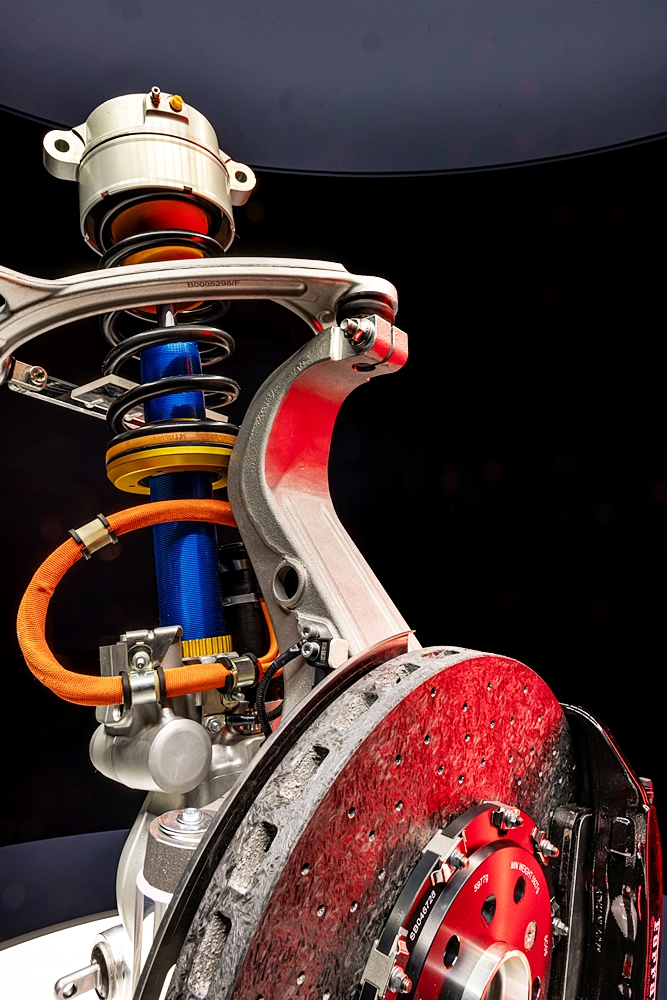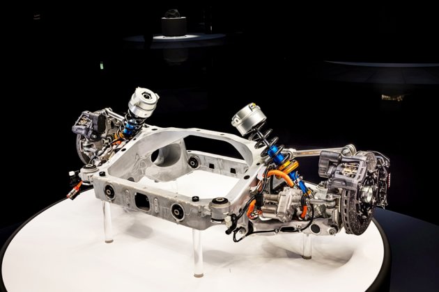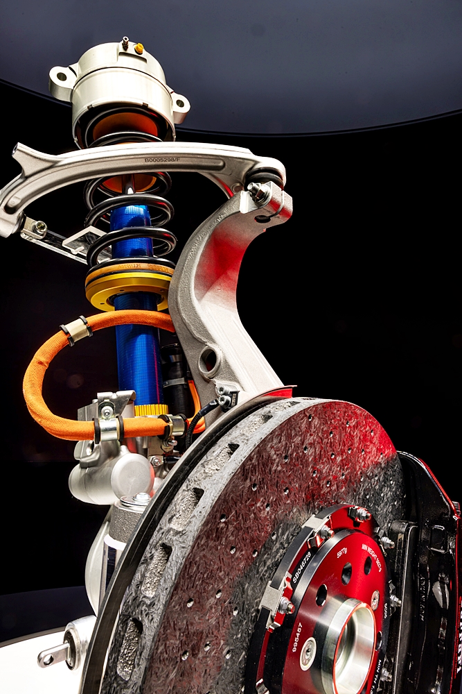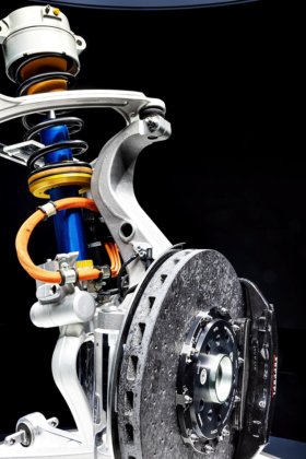 Struktur casis disepadukan dengan sistem brek seramik karbon yang direka khusus bagi mengendalikan daya regeneratif tinggi sambil mengekalkan prestasi brek konsisten.