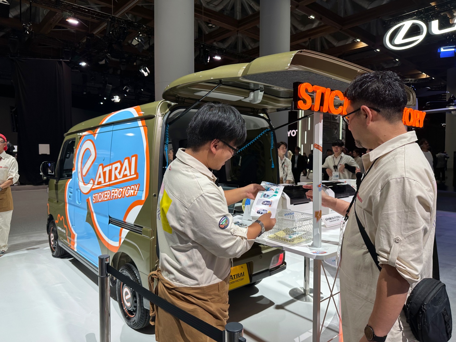 Daihatsu mempamerkan e-ATRAI, yang direka untuk menjadikan kerja harian lebih pintar dan menyeronokkan, sebagai kenderaan kilang pelekat bergerak. Pengunjung menerima pelekat kereta konsep yang dicetak sebagai cenderahati.