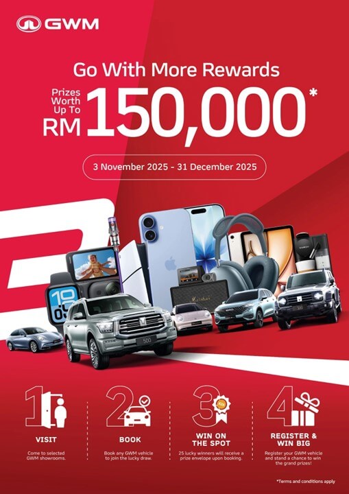 Dengan membeli mana-mana kereta GWM, rakyat Malaysia berpeluang memenangi hadiah utama bernilai keseluruhan RM150,000.