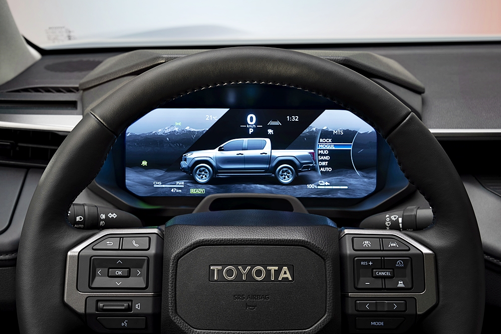 Hilux BEV turut memanfaatkan sistem Multi-Terrain Select untuk menyesuaikan prestasi kenderaan kepada pelbagai rupa bumi off-road melalui kawalan brek dan tork.