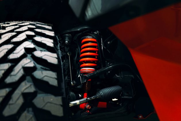 - Sistem suspensi tinggi (lifted suspension) dengan spring gegelung hadapan dan penyerap hentak berwarna merah lava khas.