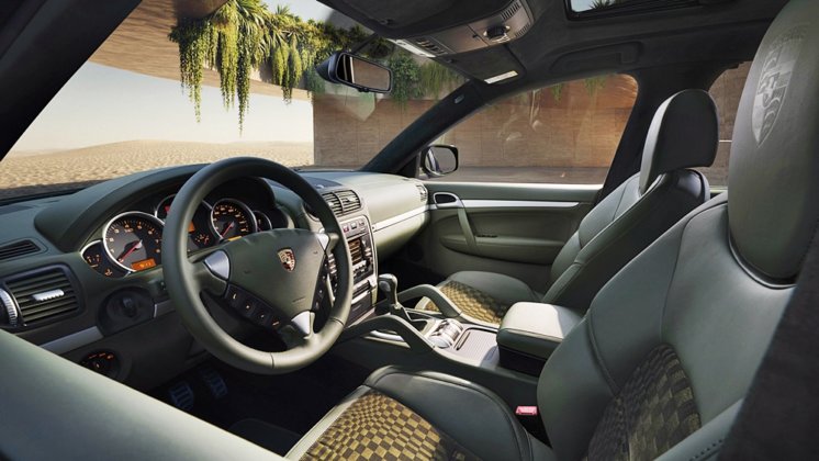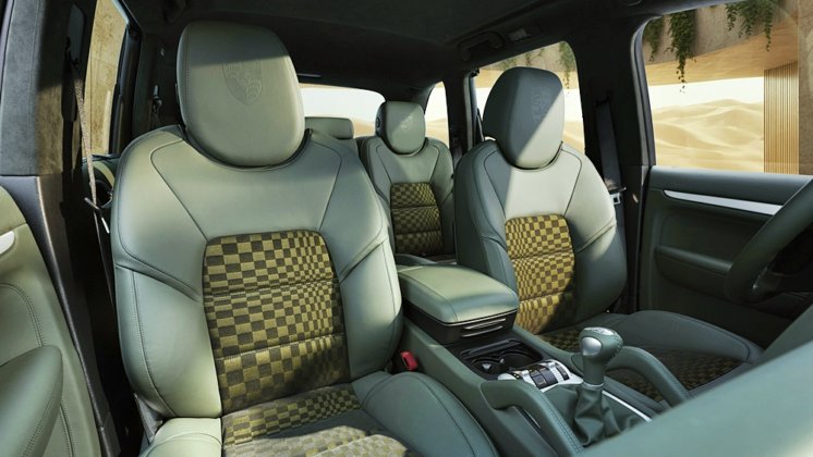- Corak Ikonik: Corak fabrik Pasha dalam warna hitam/zaitun, tekstil khas Porsche yang tipikal, digunakan pada kerusi dan bahagian dalam kotak sarung tangan.