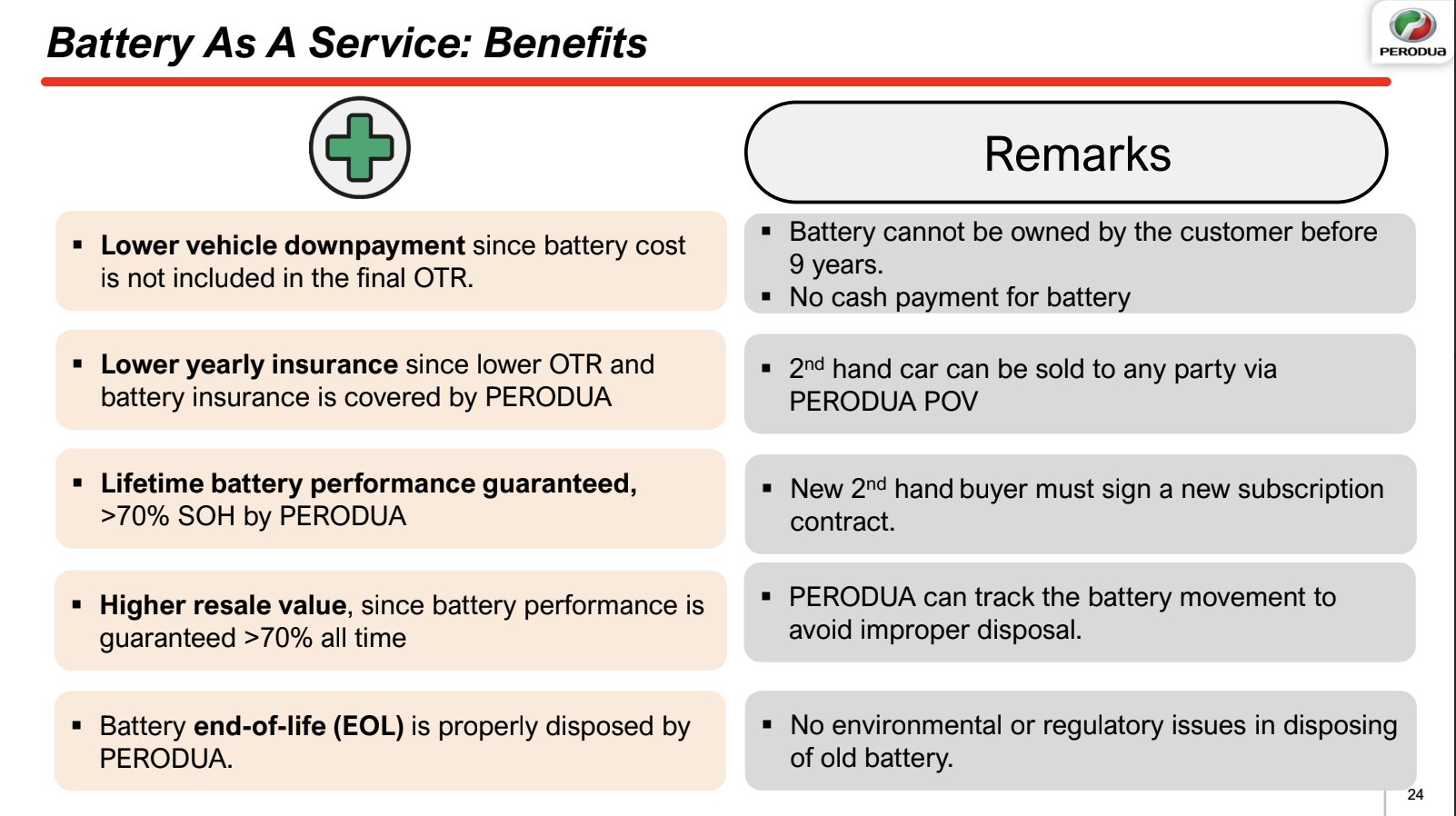 - Penyelenggaraan Bateri: Penyelenggaraan bateri, insurans bateri, dan segala-galanya yang berkaitan dengan aset bateri berada di bawah tanggungjawab Perodua.