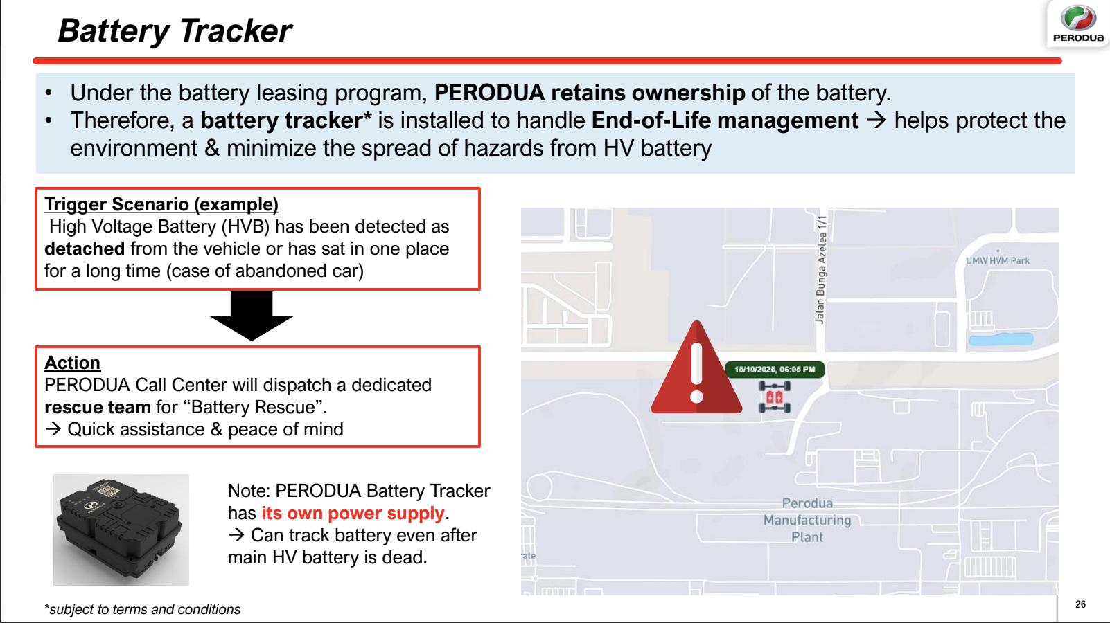 - Ada “Battery Tracker”: Setiap bateri dipasang dengan alat pengesan. Jika kereta terbiar atau bateri dicabut tanpa kebenaran, Perodua akan menghantar pasukan “Battery Rescue” untuk mengambilnya. Ini bagi memastikan keselamatan dan mencegah pencemaran.