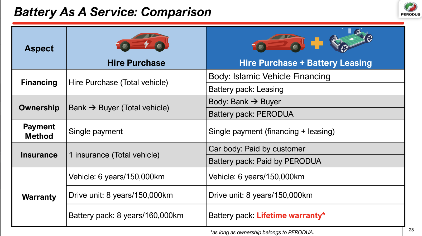 BaaS adalah mandatori dan tiada pilihan untuk membeli bateri secara langsung. Pelanggan tidak perlu membuat dua kali transaksi yang mana pembayaran (kereta+bateri) dilakukan kepada bank manakala pihak bank akan menyerahkan ansuran bateri kepada Perodua.