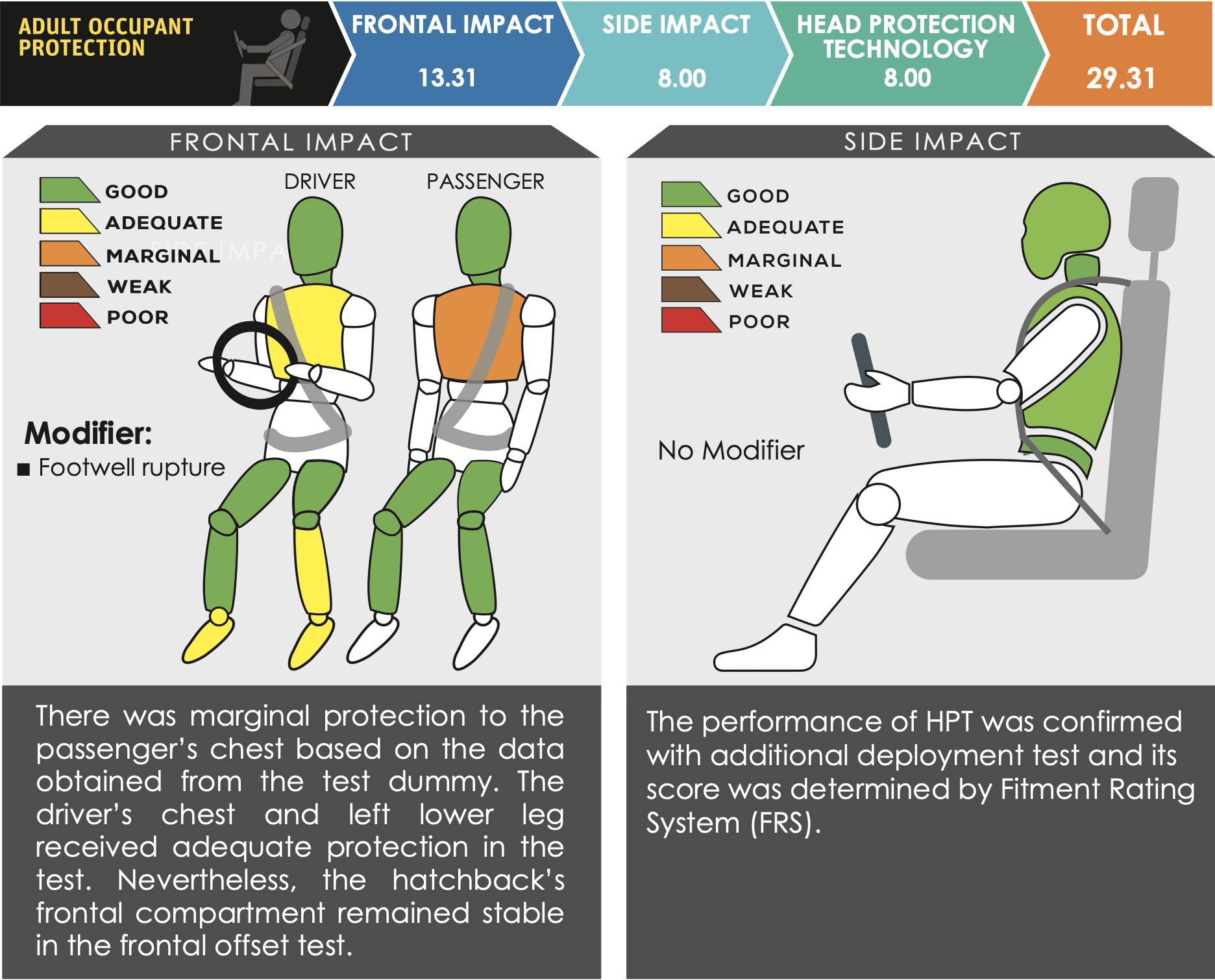 Bagaimanapun, perlindungan dada penumpang hadapan dikategorikan sebagai sederhana, manakala dada pemandu pada tahap memadai. Laporan turut mencatatkan berlaku sedikit footwell rupture semasa impak.