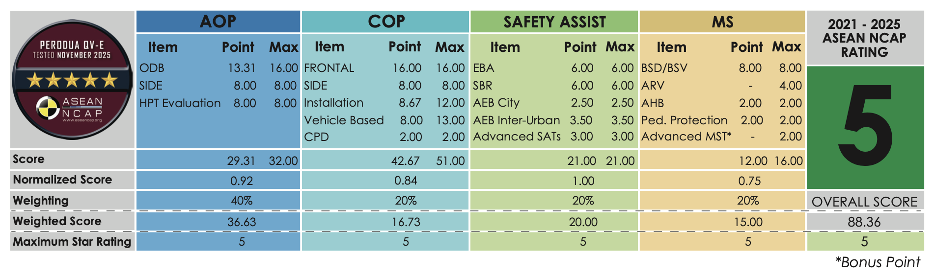 Perodua QV-E menerima penarafan lima bintang dalam ujian penilaian kenderaan baharu ASEAN NCAP mengikut protokol 2021-2025.