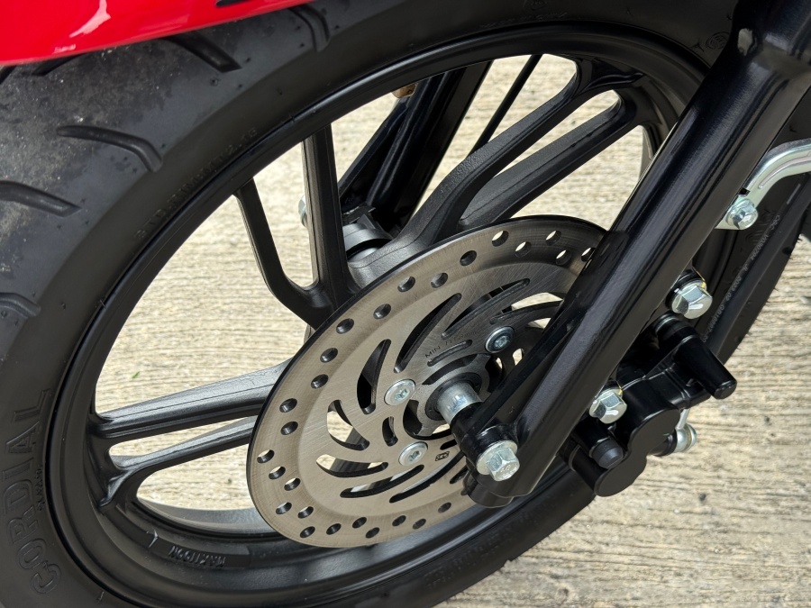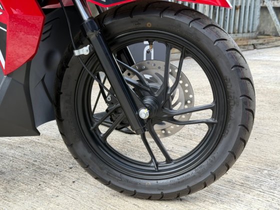 Tayar hadapan 90/90-14 dan belakang 100/90-14, dipadankan rim 14 inci, menyediakan keseimbangan baik antara keselesaan dan kestabilan.