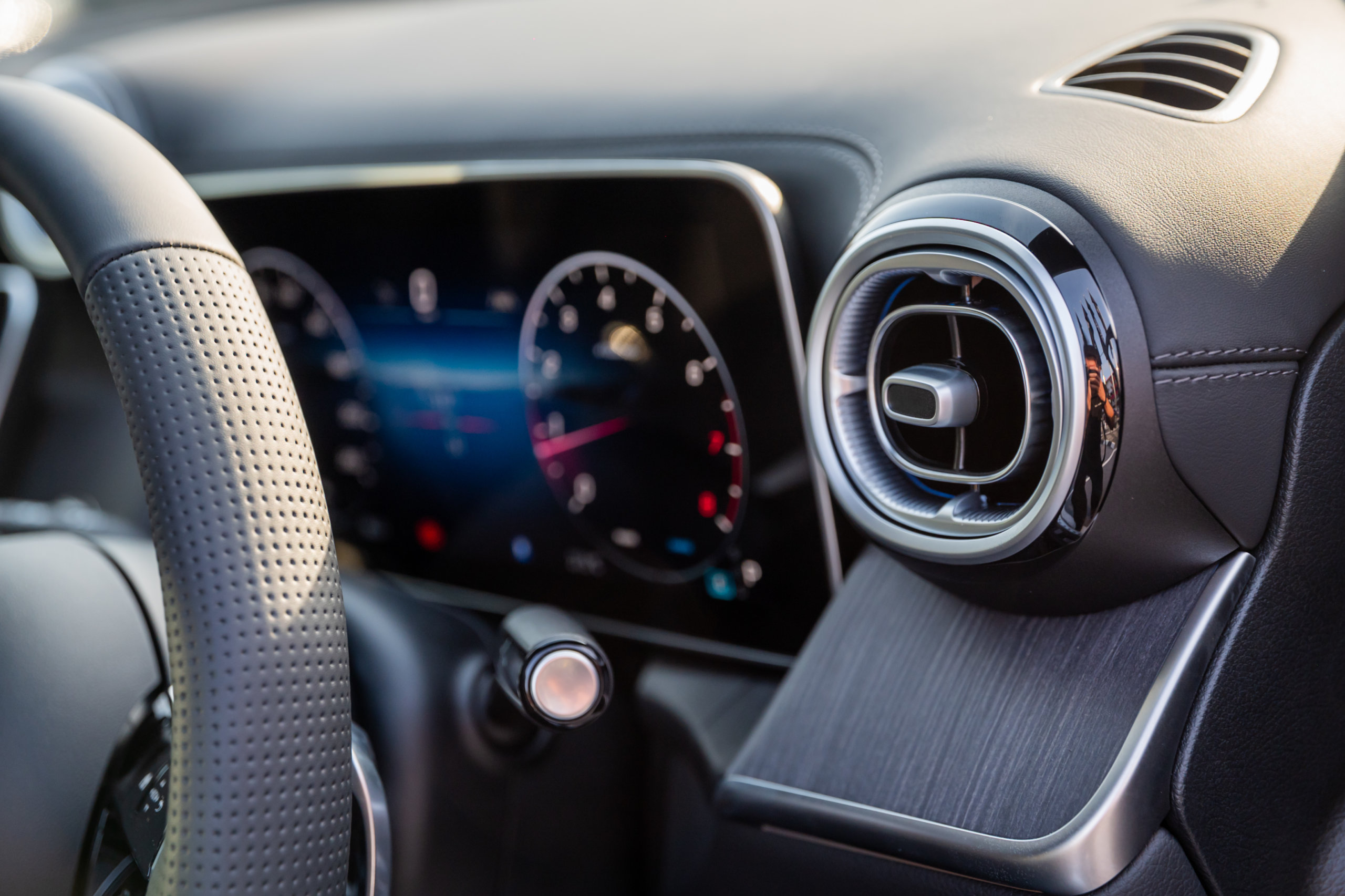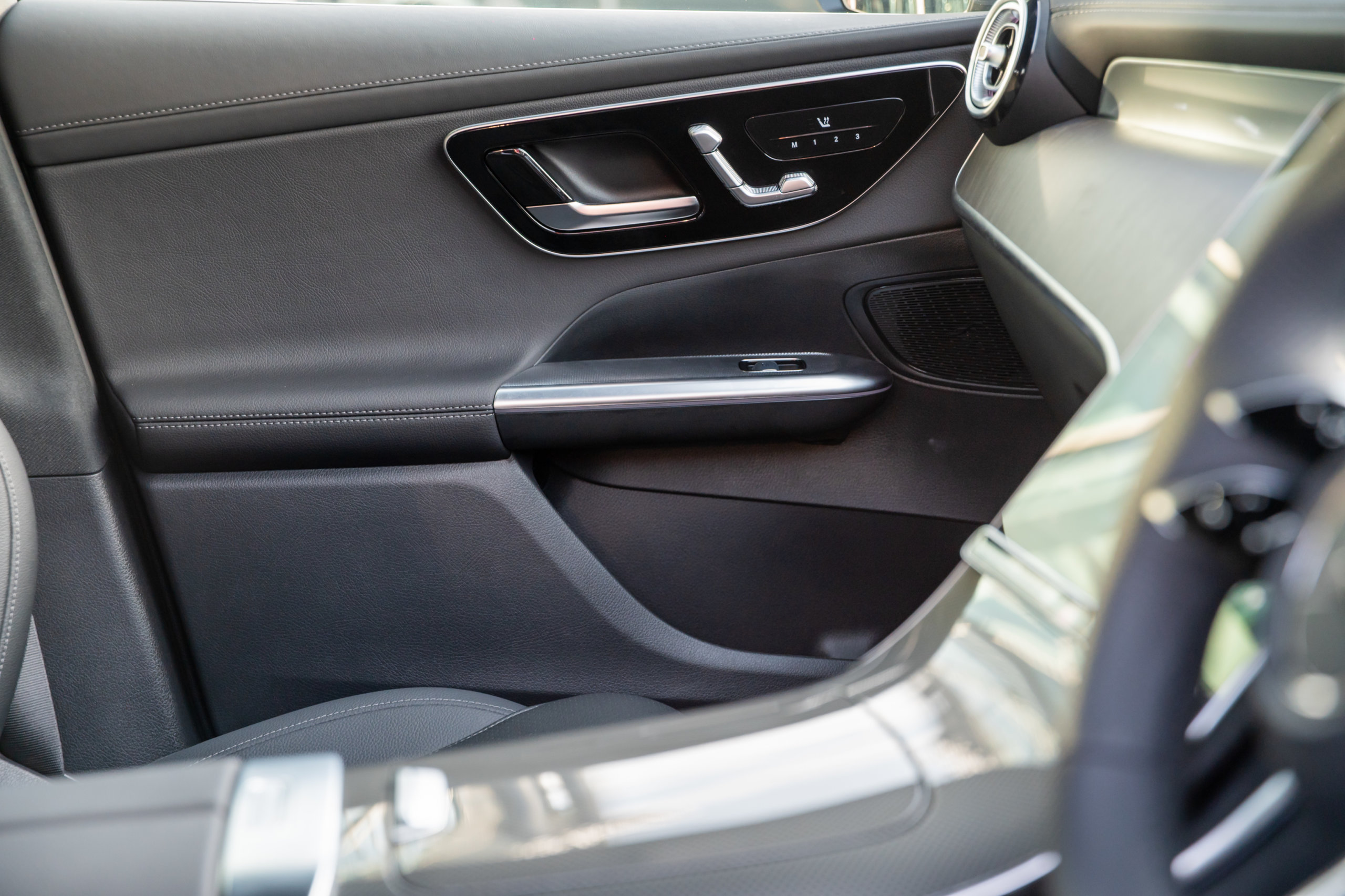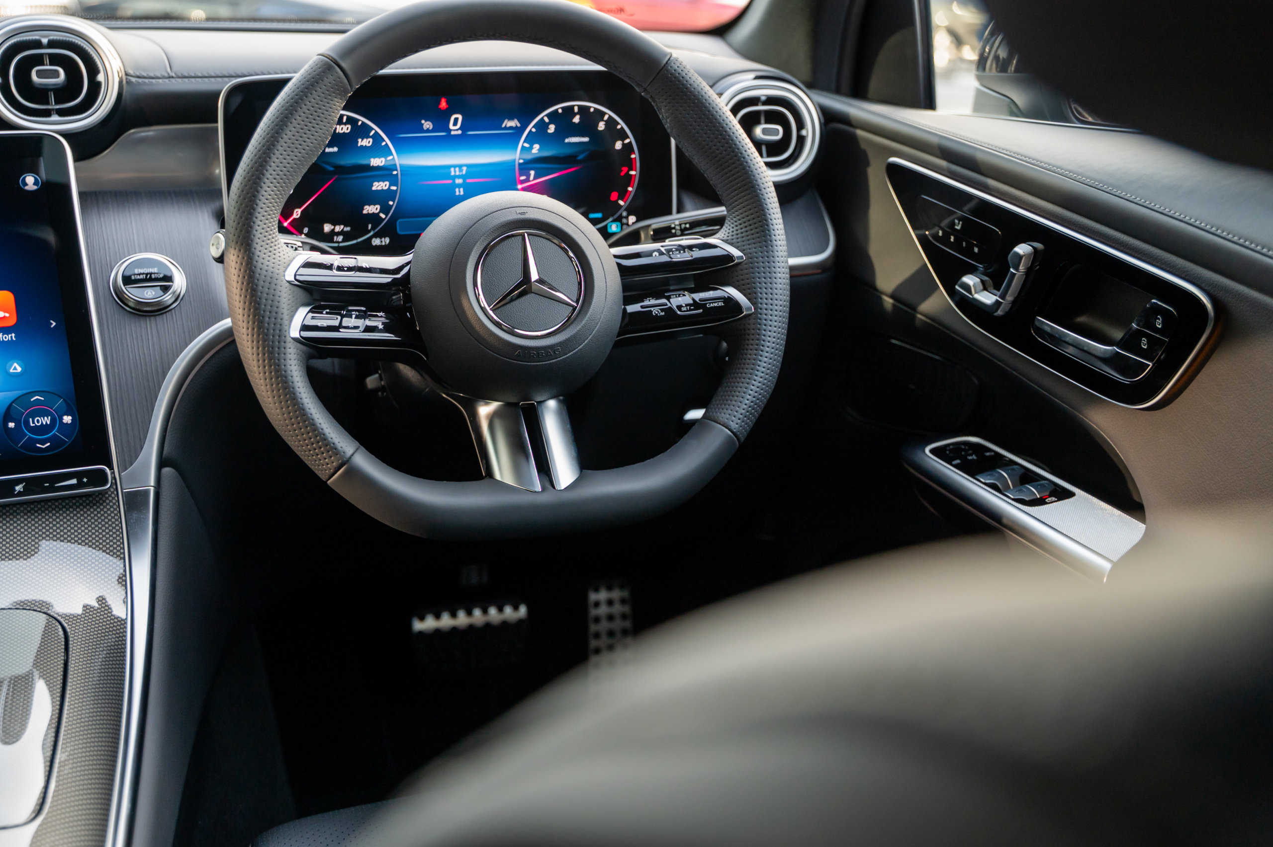 - Menampilkan dalaman AMG Line, termasuk upholsteri kulit tiruan ARTICO berwarna hitam, papan instrumen dan garis tali pinggang kemasan kulit tiruan ARTICO rupa nappa