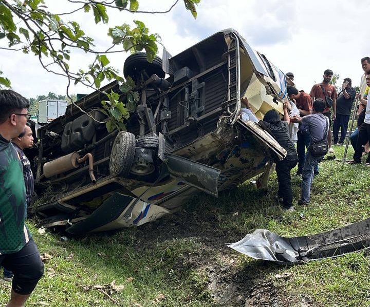 “Sampai di tempat kejadian, tayar ambulans bahagian belakang kiri telah pecah dan hilang kawalan sebelum terbabas ke bahu jalan kiri,” katanya.