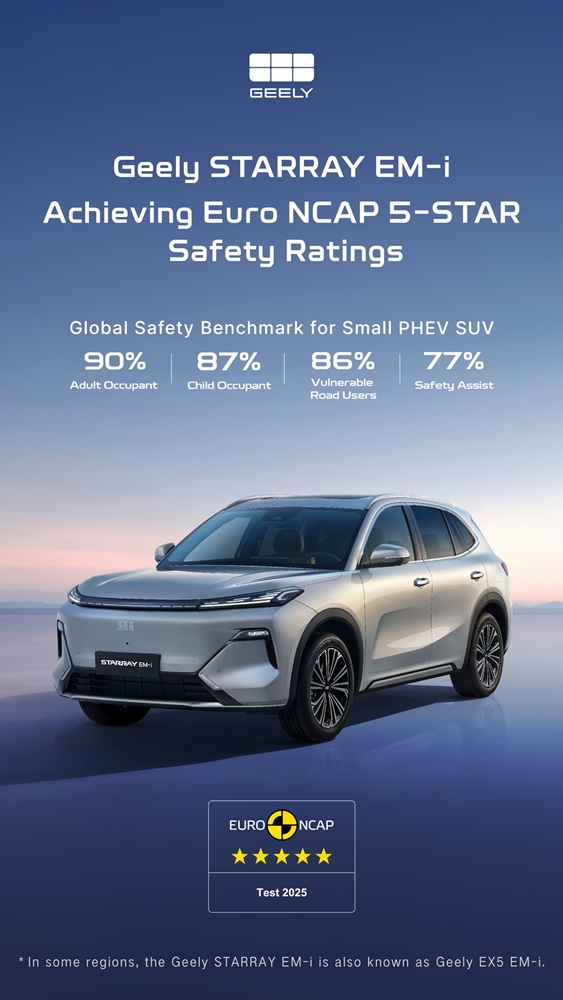 Geely Auto mengumumkan SUV hibrid plug-in (PHEV) global pertama syarikat iaitu Geely STARRAY EM-i berjaya menerima penarafan lima bintang daripada Program Penilaian Kereta Baharu Eropah (Euro NCAP).