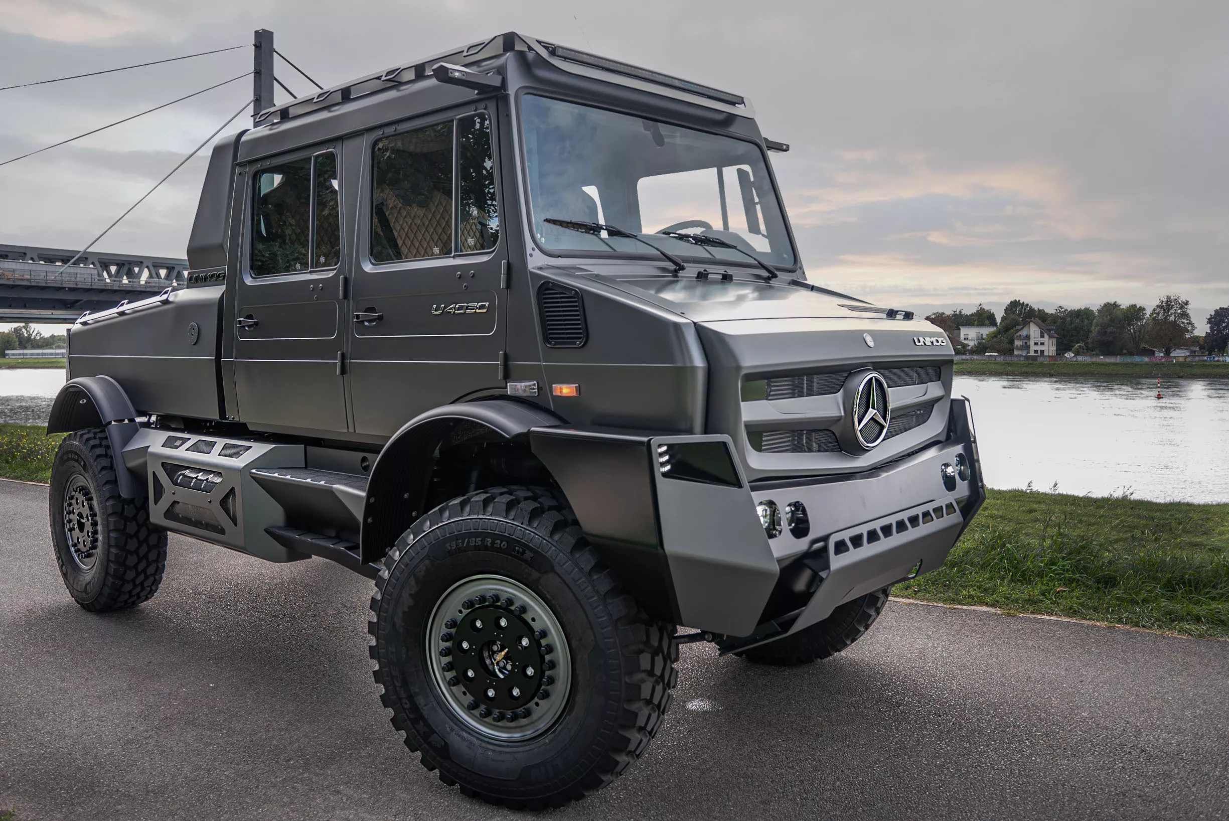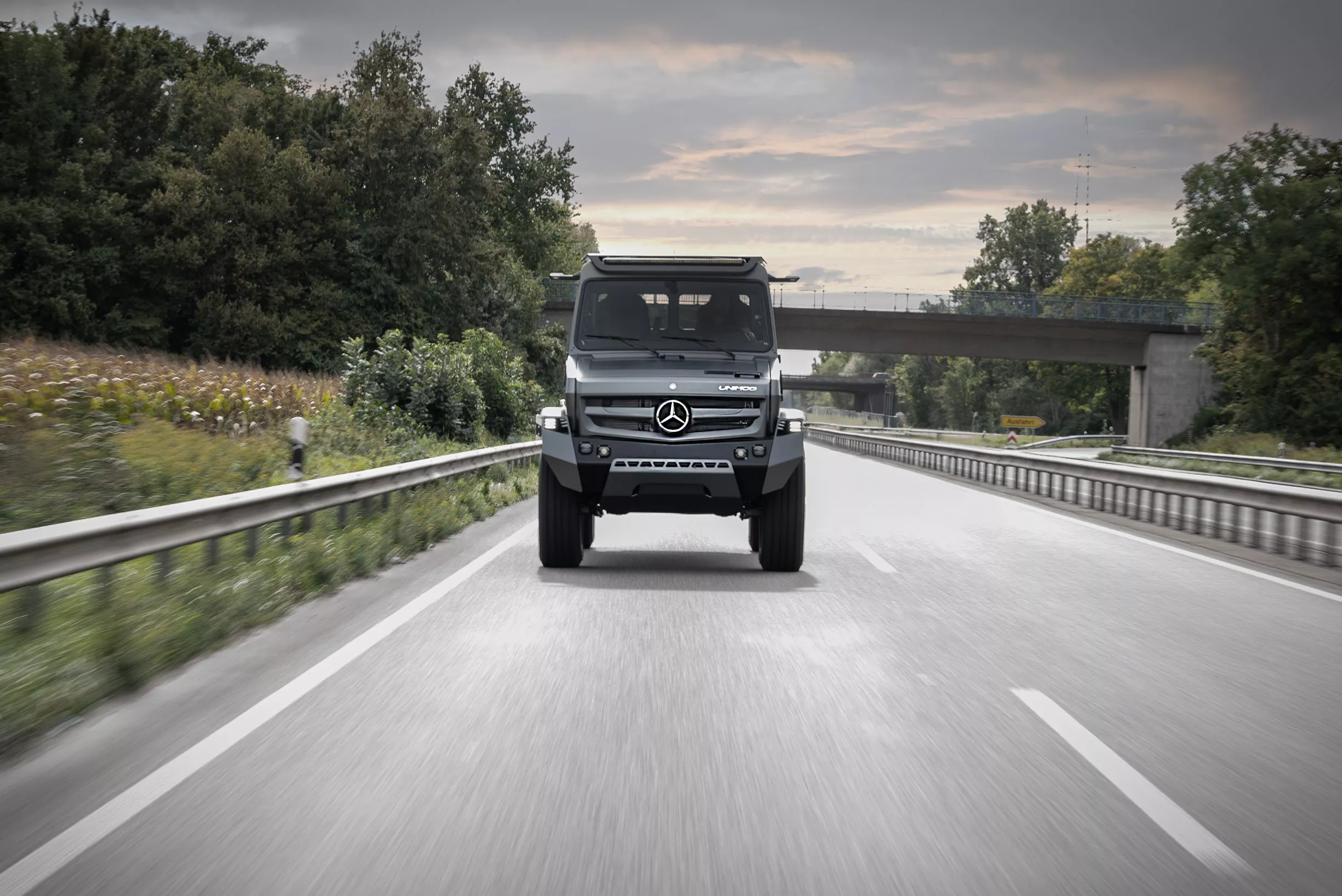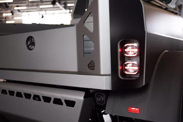 Untuk bahagian luar, Unimog ini diberikan beberapa perubahan seperti jeriji yang disemak semula, side sill, panel bed kustom, cat matte grey, rim ‘beadlock’ 20 inci, serta unit pencahayaan LED yang lebih moden.