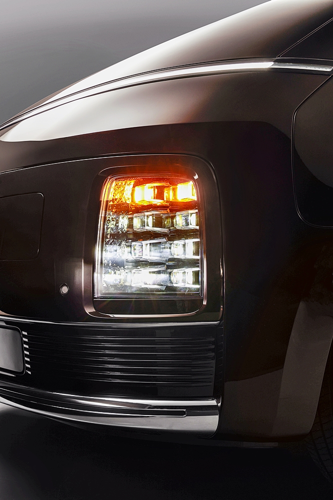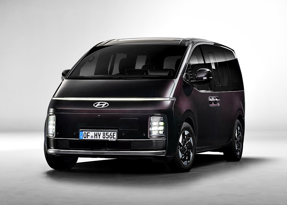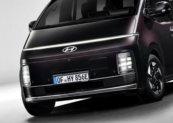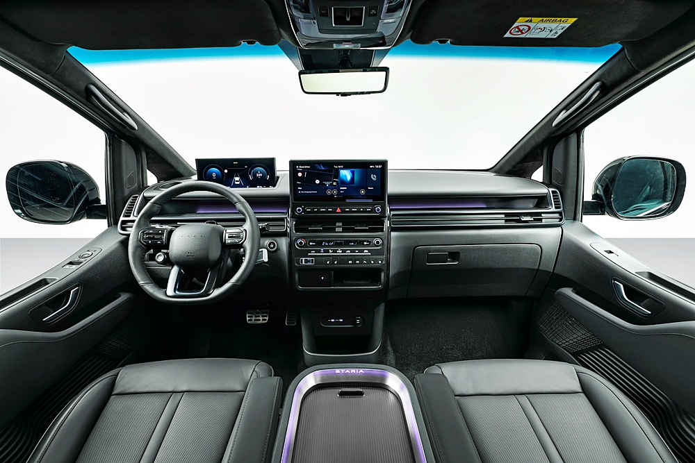 Bahagian luar mengekalkan one-curve silhouette Staria tetapi diperhalusi dengan elemen khusus EV. Bahagian depan tampil rata berbanding Staria dengan enjin biasa.