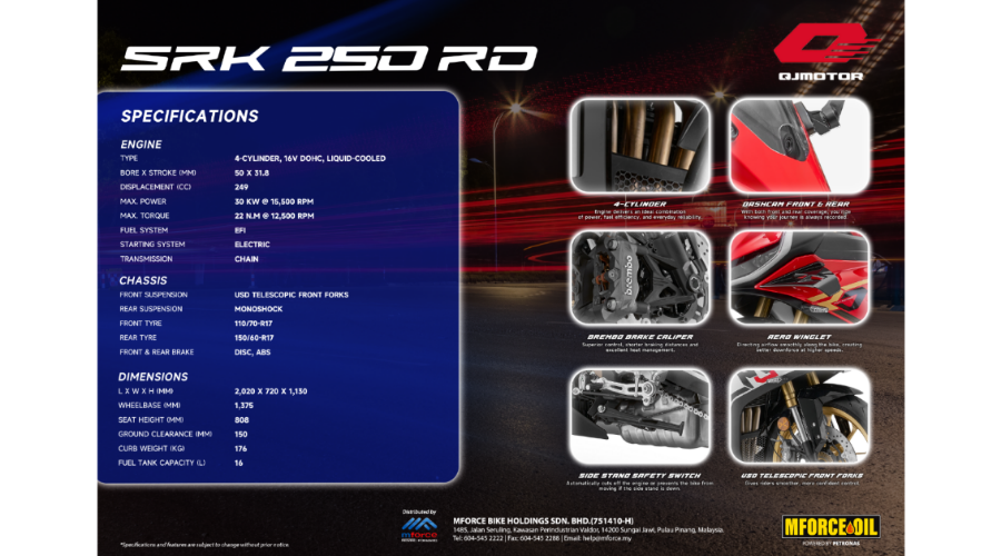 QJMOTOR SRK450RR ditawarkan pada harga RM25,888 (tidak termasuk cukai jalan dan insurans) dengan pilihan warna Black, Silver dan Red.