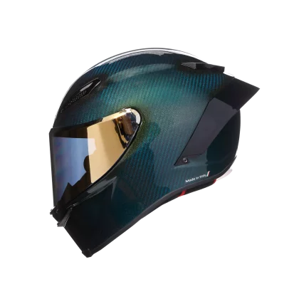 Istimewanya helmet ini, ia menggunakan tema elemen air yang menggabungkan grafik hijau laut dan emas metalik pada cengkerang karbon.