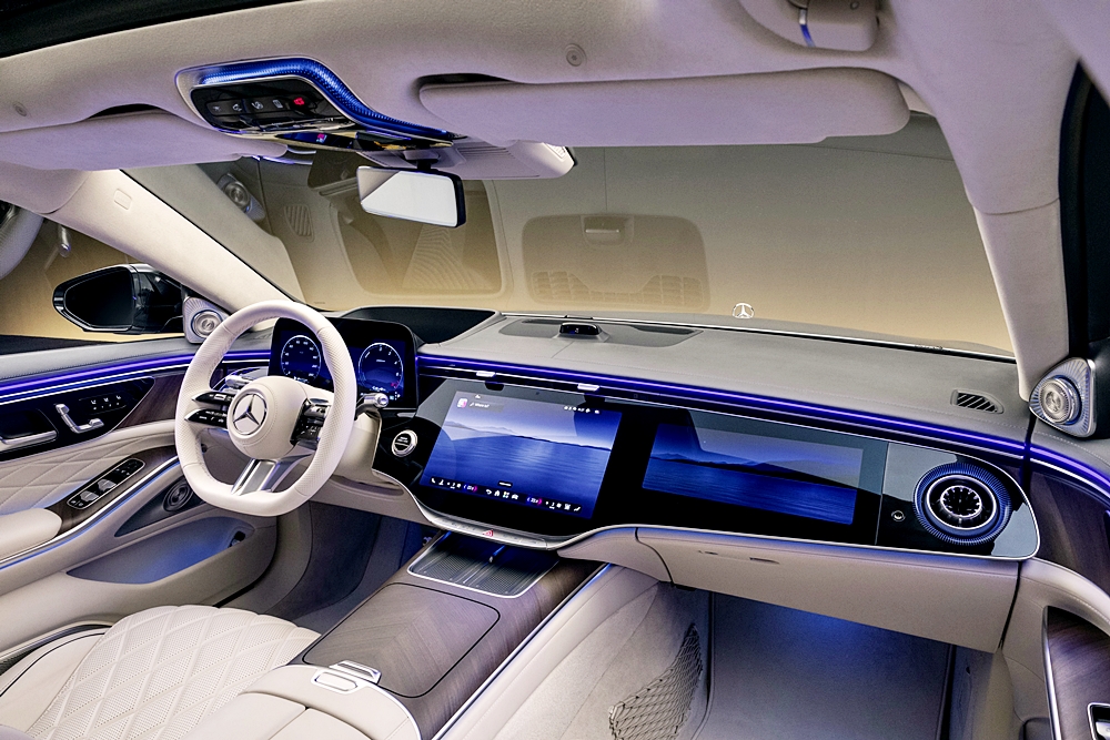 MBUX Superscreen menyatukan paparan tengah 14.4 inci dan paparan penumpang 12.3 inci di bawah satu permukaan kaca yang bersambung.