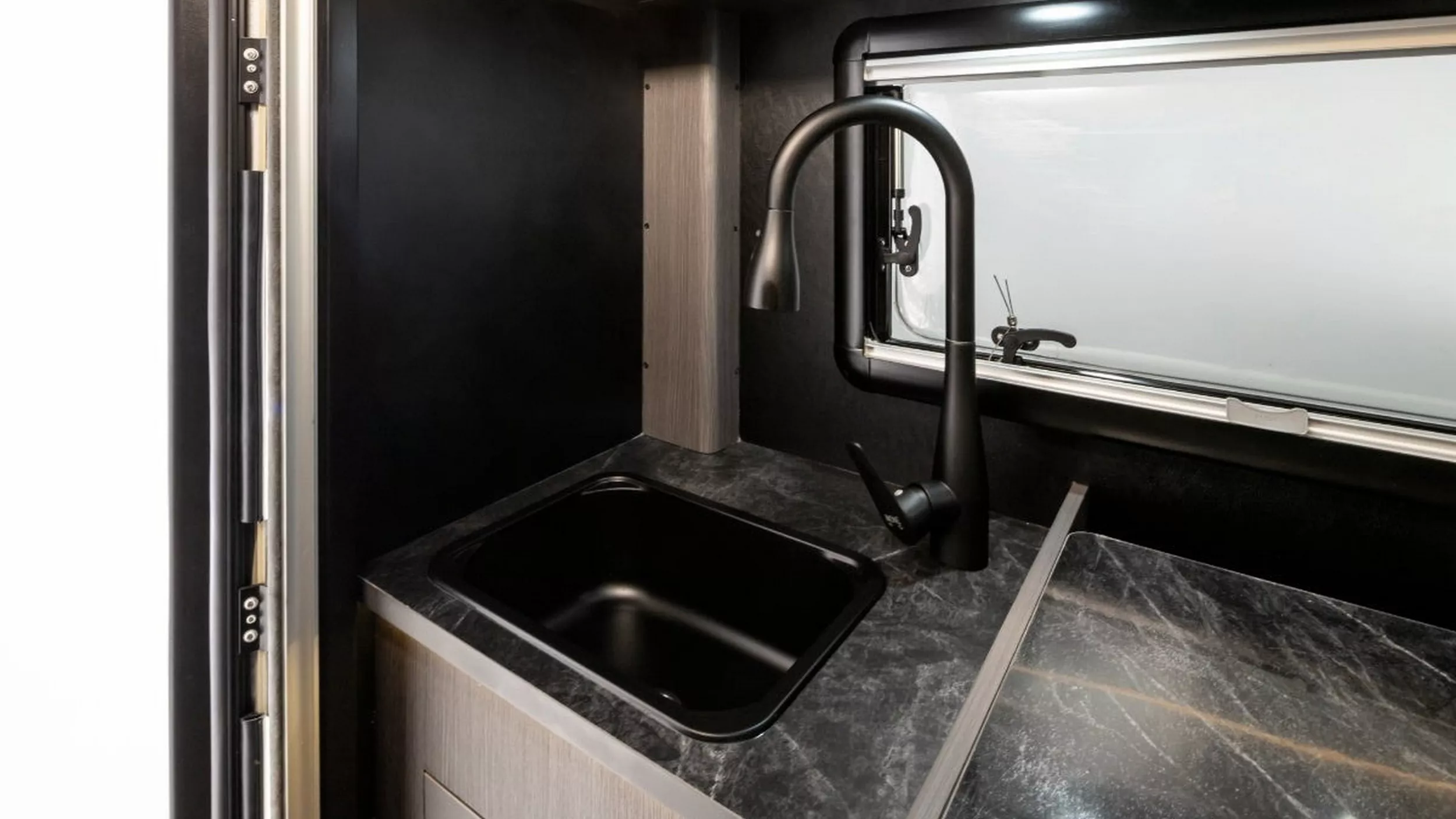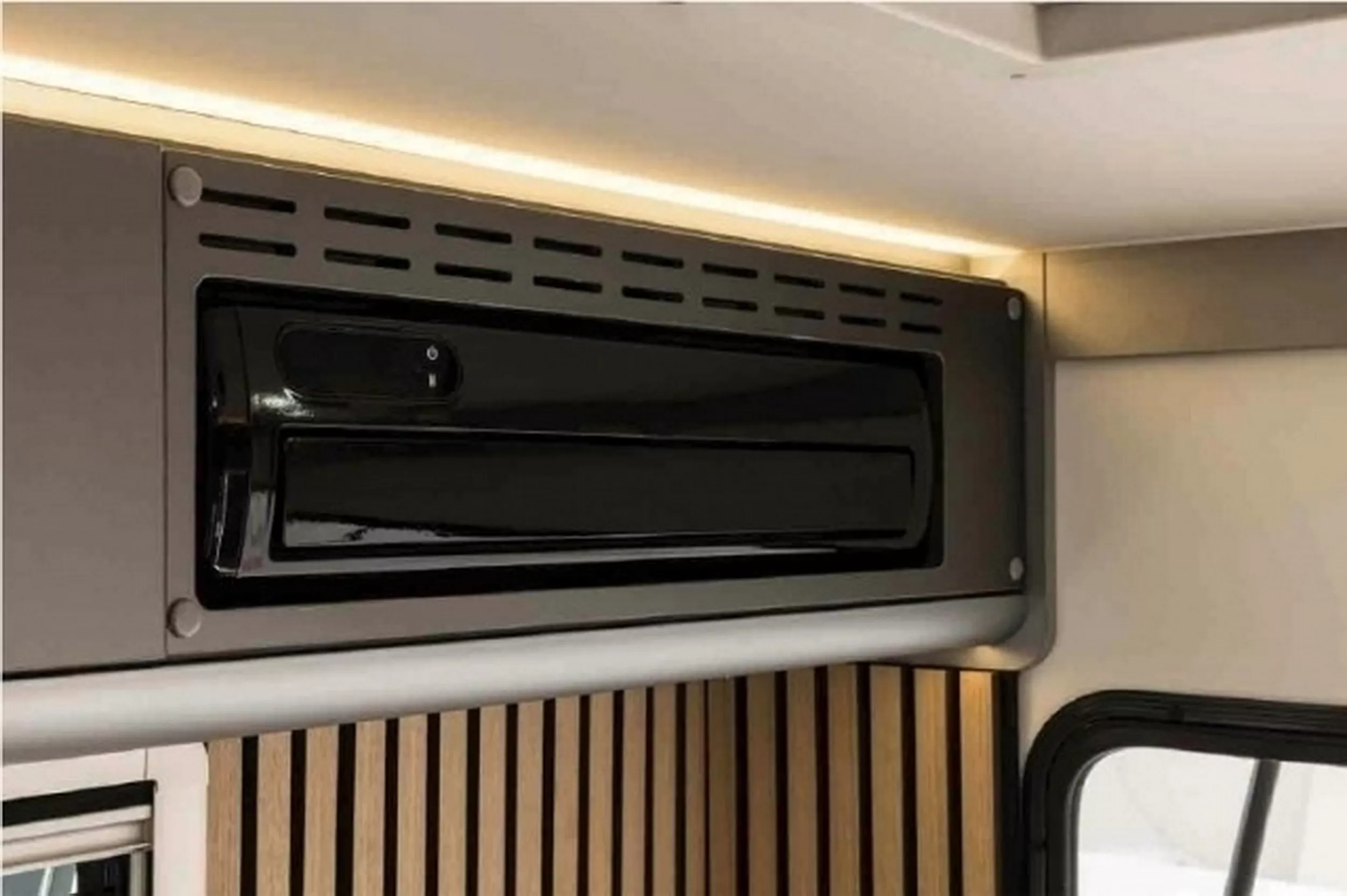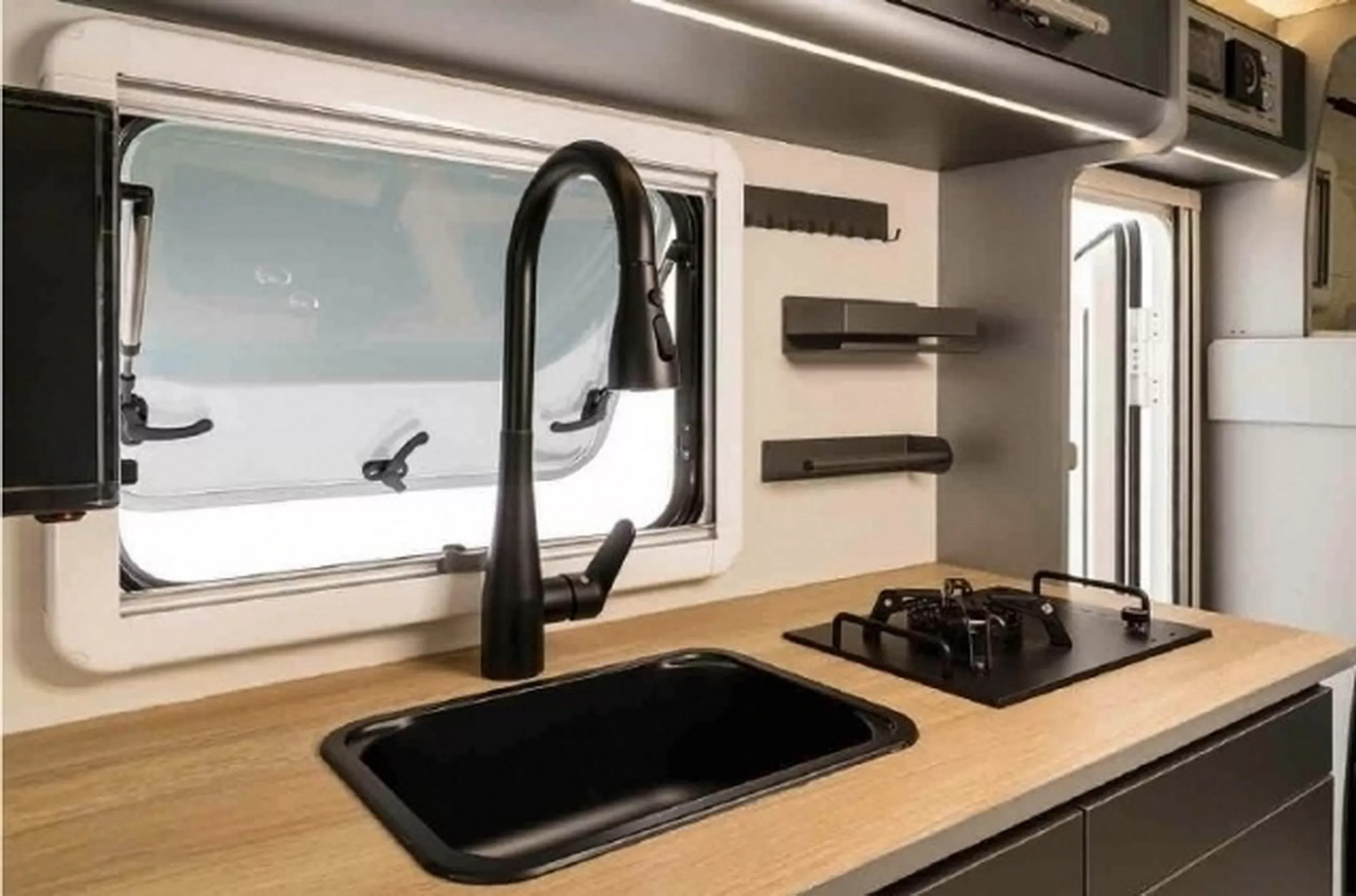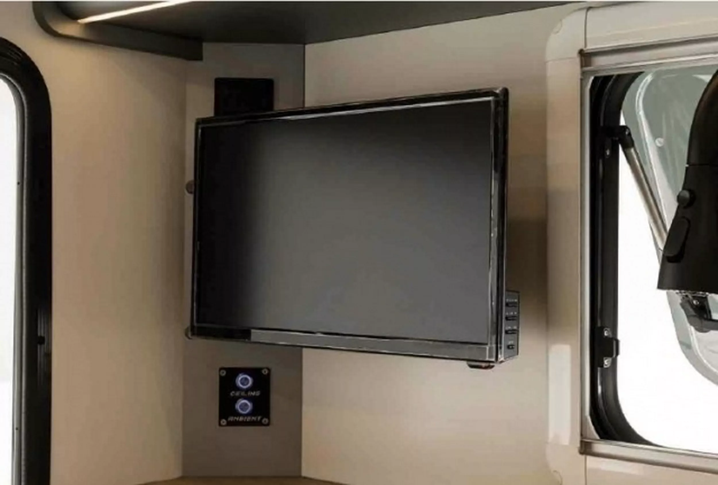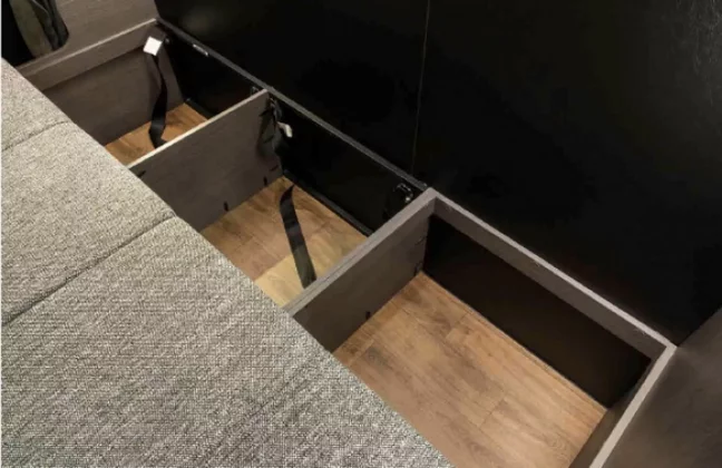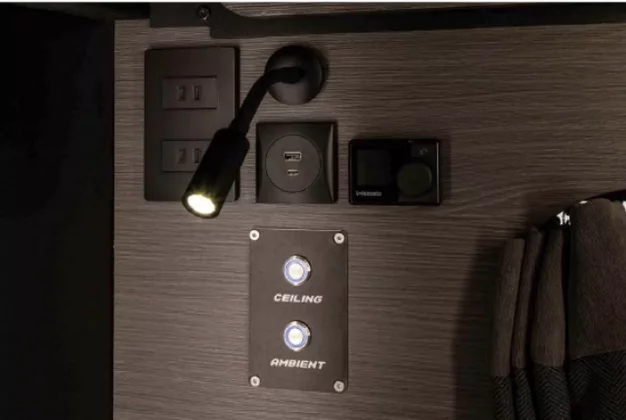 Walaupun kecil, ia masih memuatkan sinki, microwave, peti sejuk 35 liter, TV, ruang simpanan bawah katil, lampu ambien dan unit A/C. Ada juga panel kawalan dan banyak port USB.