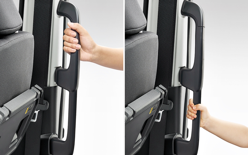 Pintu ini juga dilengkapi fungsi kunci boleh atur cara. Bagi memudahkan kanak-kanak dan orang dewasa, pemegang bantuan bersaiz besar turut dipasang pada tiang kenderaan.