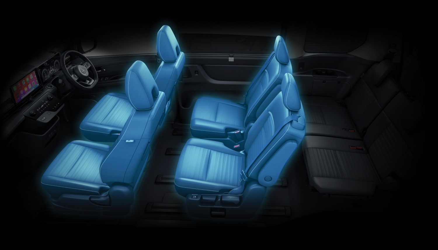 - Teknologi Zero Gravity, tempat duduk barisan pertama dan kedua direka untuk mengurangkan keletihan dan hayunan kepala
