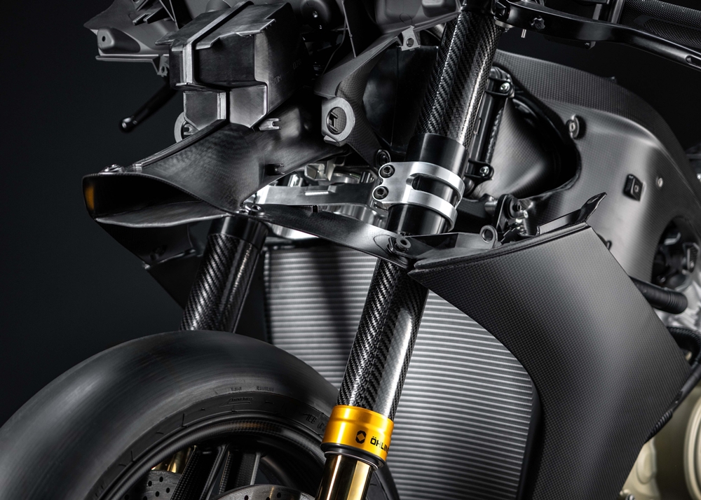 Bahagian hadapan menggunakan suspensi bertekanan (pressurised) Öhlins NPX 25/30 Carbon dengan sarung gentian karbon yang mengurangkan berat sehingga 10 peratus berbanding Panigale V4 standard.