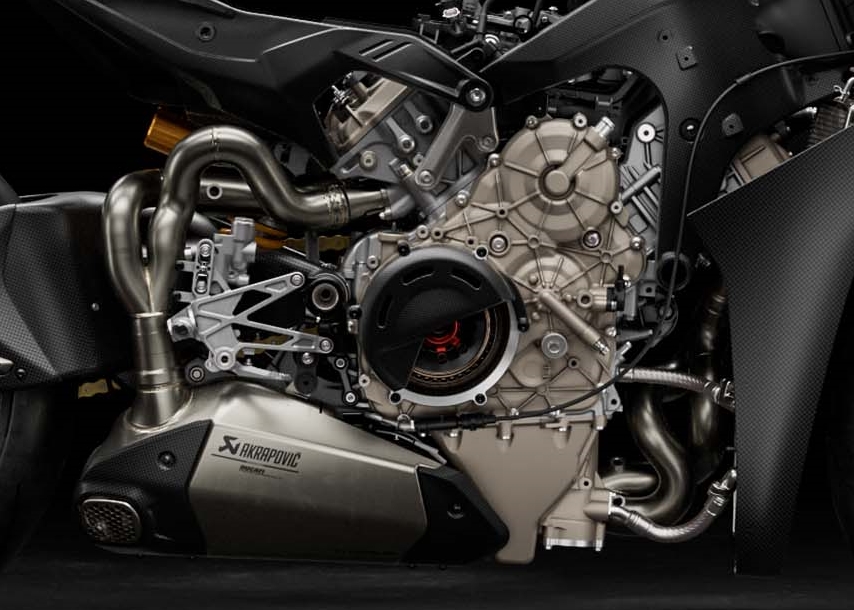Enjin ini 3.6 kg lebih ringan berbanding unit 1,103 cc pada Panigale V4 dengan klac kering hasil penggunaan titanium dan komponen dalaman yang direka semula.