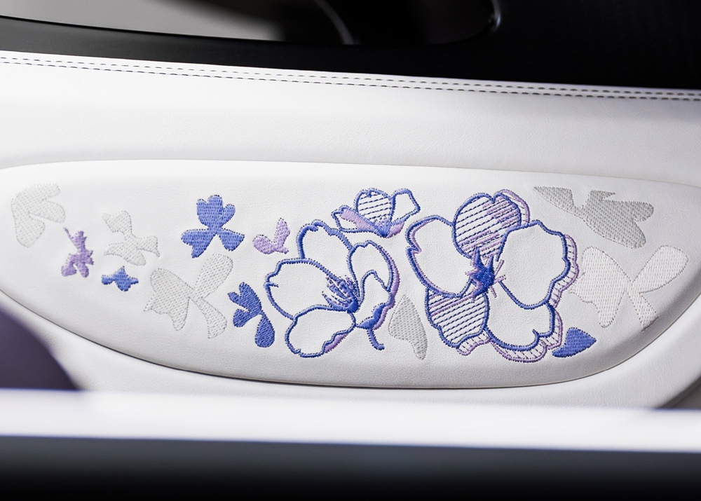Pada panel pintu, sulaman bunga direka seolah-olah kelopak sedang ditiup angin bagi memberikan kesan pergerakan.