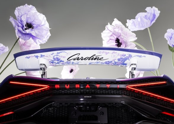 Setiap kelopak bunga dilukis dengan tepat bagi memberikan kesan kedalaman. Di bahagian tengah sayap, nama Caroline ditulis mengikut reka bentuk signatur Bugatti.